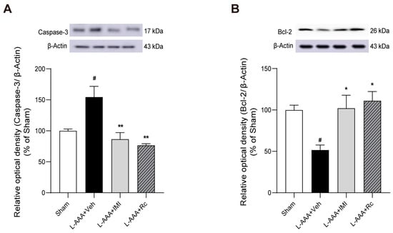 Given the potential role of apoptosis in depression and neuroinflammation, the effects of G-Rc on key apoptosis-related proteins were examined. To investigate this, Western blot analyses of caspase-3 and Bcl-2 were performed. The results showed a significant increase in caspase-3 levels in the L-AAA + Veh group compared to the sham group (p < 0.05). G-Rc treatment significantly decreased caspase-3 levels compared to the L-AAA + Veh group (p < 0.01) (Figure 4A). Bcl-2 levels were significantly decreased in the L-AAA + Veh group compared to the sham group (p < 0.05). G-Rc treatment significantly increased Bcl-2 levels compared to the L-AAA + Veh group (p < 0.05) (Figure 4B). These findings suggest that G-Rc may modulate apoptotic pathways in L-AAA-induced depression, potentially contributing to its therapeutic effects.