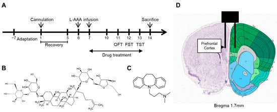 (A) Timeline of the experiment, structural formula of (B) ginsenoside Rc and (C) imipramine, and (D) location of the L-AAA infusion. For injection of the prefrontal cortex, the following coordinates were used: AP 1.7 mm, ML ± 0.3 mm, and DV −2.5 mm from the bregma. Allen Mouse Brain Atlas, mouse.brain-map.org [] (accessed on 8 July 2024) and atlas.brain-map.org [] (accessed on 8 July 2024). L-AAA, L-alpha-aminoadipic acid; OFT, open-field test; FST, forced swimming test; TST, tail suspension test; AP, anterior–posterior; ML, medial–lateral; DV, dorsal–ventral.