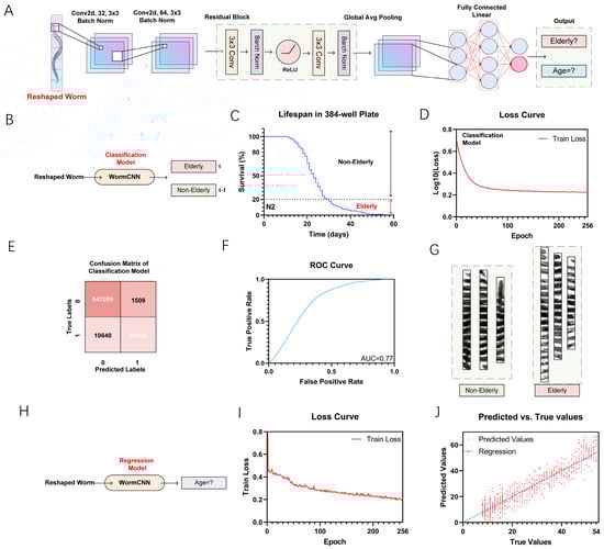 Comprehensive Overview of WormCNN’s Application in Classifying and Predicting the Lifespan of C. elegans. (A) Schematic of the WormCNN architecture showing various layers and their configurations used for processing the worm images. (B) Diagram illustrating the classification model workflow, where reshaped worm images are input into WormCNN to classify worms into elderly and non-elderly categories. (C) Lifespan curve in a 384-well plate showing the survival percentage of worms over time used to define the elderly threshold. The original image data can be found in Supplementary Table S1. (D) The loss curve for the classification model indicates the log-loss reduction as training progresses over epochs. (E) The confusion matrix of the classification model displaying the numbers of true positives, false positives, true negatives, and false negatives. (F) ROC curve illustrating the true positive rate against the false positive rate. (G) Reshaped worm images used in training the WormCNN, with images on the left representing non-elderly worms and those on the right depicting elderly ones. (H) Diagram illustrating the regression model workflow, where WormCNN estimates the actual ages of worms. (I) The loss curve for the regression model showing the decline in training loss, reflecting learning efficiency and model convergence. (J) A scatter plot compares predicted versus true age values, with a regression line indicating the accuracy of the age estimations. In this article, the predicted values are used as the “Healthy Aging Index” (HAI), which quantifies the deviation of each worm’s predicted age from its actual age.