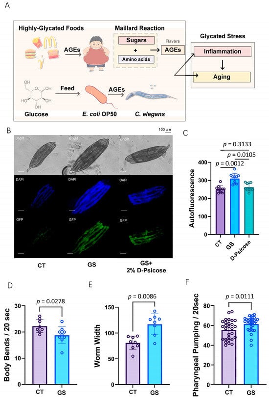 Evaluating the Impact of GS (GS) in C. elegans. (A) Schematic overview showing the formation and impacts of GS and AGEs. This panel depicts the dietary sources of AGEs, the Maillard reaction producing AGEs, and the subsequent GS leading to inflammation and aging in organisms. (B) Representative images of C. elegans under different treatments. The top row shows bright-field images, the middle row features DAPI staining of nuclei, and the bottom row illustrates GFP expression in worms. These images compare to control (CT), GS group, and GS plus 2% D-Psicose fed groups. The scale bar for panel B is 100 μm. (C) Quantification of autofluorescence levels across different groups, demonstrating the reduction of AGE accumulation when D-Psicose is included in the diet. The original data for this panel can be found in Supplementary Table S2. (D) Measurement of body bends per 20 s indicating the locomotor activity of worms under different treatments. The original data for this panel can be found in Supplementary Table S3. (E) Worm width, reflecting potential morphological changes induced by GS and the effect of D-Psicose. The original data for this panel can be found in Supplementary Table S4. (F): Pharyngeal pumping rates over 20 s, highlighting the effects of GS on feeding behavior in C. elegans. The original data for this panel can be found in Supplementary Table S5.