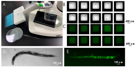 For experimental observations, worms are distributed into 384-well plates, with each well containing one or two worms. This setup facilitates high-throughput imaging and individual analysis, enabling detailed observation of phenotypic and behavioral traits under various experimental conditions. Figure 5A–E illustrate the setup and examples of worm placement within the wells, providing visual support for the described methodology.