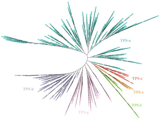 - Jiang, S.Y.; Jin, J.; Sarojam, R.; Ramachandran, S. A comprehensive survey on the terpene synthase gene family provides new insight into its evolutionary patterns. Genome Biol. Evol. 2019, 11, 2078–2098. [Google Scholar] [CrossRef] [PubMed]
