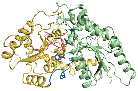 In the case of plants, UGTs catalyze a glycosidic bond formation using sugar donor containing a nucleoside phosphate, usually UDP-glucose (UPG) [20,21]. And, for nucleotide sugar-dependent enzymes, it is noted for its two structural folds: GT-A and GT-B [20]. Glycosyltransferase UGT71C5 adopts the GT-B fold, where the architecture consists of two β/α/β Rossmann-like domains, both featuring a central β-sheet. Two domains abutted by a flexible linker face each other, with the active sites positioned in the resulting clefts, the sizes of which vary, and the internal space in the N-terminal domain is provided for acceptor substrate binding, while the counterpart in the C-terminal domain is for the donor substrate [20,22] (Figure 1). Most plant UGTs present a common plant secondary product glycosyltransferase (PSPG) motif, and the conserved signature motif contains ~44 amino acids near the C-terminus [23,24,25], where the residues can identify the donor substrate [16]. In terms of UGT71C5, it contains a UGTPG motif similar to the PSPG motif at its C terminus [19]. In addition, GT-B-fold UGTs contain a conserved His–Asp catalytic pair in which the hydrogen bond between His and Asp is indispensable for the effective deprotonation of His through the charge relay system with a negatively charged Asp [26,27]. Among the UGTs of this type, glycosylation is likely to follow a typical inverting mechanism, that is, His would serve as a general base that deprotonates the hydroxyl group of acceptor substrates, and then anomeric C1 carbon on the glucose moiety is attacked by a nucleophilic oxyanion [22,28,29,30].