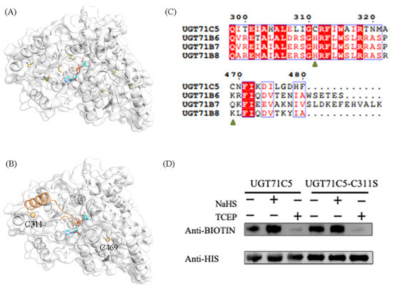 UGT71C5 contains seven cysteine residues (Figure 2A). We carried out the assessment of potential cysteine modification sites in UGT71C5 with the pCysMod server, a predictor developed based on deep learning (http://pcysmod.omicsbio.info/webserver.php (accessed on 10 July 2023)) [42]. The predictions made by the pCysMod server are C311 and C469 (Figure S1). The distribution of the two cysteine sites in UGT71C5 are illustrate in Figure 2B. It was noted that one α-helix structure connects the situated loop of C311 and the U-shaped loop constituting the UPG binding site; thus, it was expected that the persulfidation of C311 could induce a conformational effect and then influence the function of UGT71C5. We also performed a sequence alignment of UGT71C5 and other UGT enzymes, which transform free ABA into a conjugated form as well [18]. It was shown that site 311 is located in a relatively conserved region, while site 469 is characterized as a variable. Site 311 in UGT71C5 is a cysteine residue, and the equivalent is a histidine residue in other UGTs (Figure 2C).