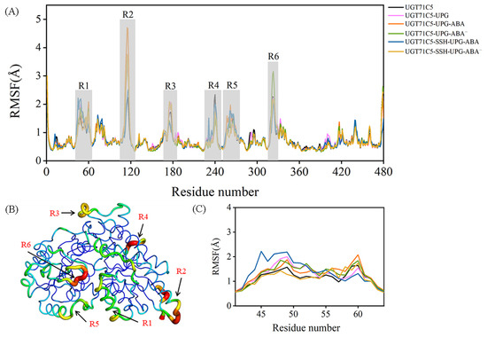 Root mean square fluctuation (RMSF) as a function of the residue number. (A) Cα RMSFs of UGT71C5s. Six regions with even larger RMSF values are highlighted in light gray. (B) Sausage presentation of UGT71C5 system with the width and color (blue to red) related to the RMSF values. Six regions with higher flexibility. (C) The enlarged view of the RMSF profile of R1 region. Description of the systems: UGT71C5 refers to substrate-free UGT71C5; UGT71C5-UPG refers to UPG-bound UGT71C5; UGT71C5-UPG-ABA refers to UGT71C5 complexed with UPG and protonated ABA; UGT71C5-UPG-ABA− refers to UGT71C5 complexed with UPG and deprotonated ABA; UGT71C5-SSH-UPG-ABA refers to persulfidated UGT71C5 complexed with UPG and protonated ABA; UGT71C5-SSHUPG-ABA− refers to persulfidated UGT71C5 complexed with UPG and deprotonated ABA.