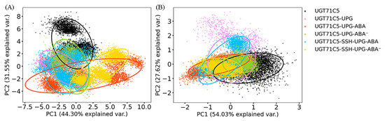 Previous studies demonstrated a relationship between linker flexibility and protein function [44,45]. In order to determine the role of the linkers in UGT71C5, we carried out a principal component analysis (PCA) with a varimax rotation for the linker on the replicated simulations of all systems, which could help to characterize the essential dynamics. For the rotated PCA of the linker, the first two principal components (PC1 and PC2) (eigenvalues: 8.70 and 6.19, respectively) represented 75.85% of the variability, with PC1 explaining 44.30% of the total variance and PC2 explaining 31.55%. As shown in Figure 4A, the UGT71C5 system plays a considerable role in explaining the variation due to PC2 compared to PC1, and for the UGT71C5-UPG system, it demonstrates an increased contribution to the variability attributed to PC1 relative to the apo form. Meanwhile, the contribution to the variability along PC2 is notably reduced, suggesting the linkers in the UGT71C5 and UGT71C5-UPG systems likely differ in molecular dynamics, that is, the binding of UPG induces different behavior of the linker. In the bound form of UGT71C5 complexed with UPG and protonated ABA, it significantly contributes to the variability in PC1 and moderately in PC2, demonstrating a more pronounced presence in shaping the motion mode characterized by PC1 and a secondary involvement in the motion mode related to PC2. For the system where ABA deprotonated within the binding site, it explains a smaller proportion of the variability on PC1 and almost same proportion to PC2 compared with the UGT71C5-UPG-ABA system. The various behaviors of the linkers in the three cases, namely, the absence of ABA from the biding site and the presence of ABA in its protonated and deprotonated states, imply that there may be a structural element related to both substrate bindings. We then take the U-shaped loop into consideration as it constitutes UPG binding site and belongs to ABA surrounding in space. It is possible for the binding of ABA to exert influence over the behavior of U-shaped loop, further to UPG at binding site accompanied by alteration of the linker. Furthermore, the persulfidated site (C311) is located at a loop joining the α-helix and β-strand, where the α-helix is also a flank of the U-shaped loop, thus it is also possible for persulfidation to exert influence over the behavior the linker indirectly. The persulfidation indeed influences the dynamics of the linker as indicated by the change of contribution to the variability on both PC1 and PC2 in persulfidated systems compared to non-persulfidated counterparts. Together these results emphasized the plasticity of the linker as well as complicated dynamic behavior.