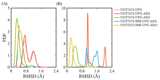 Analysis of the binding stability of two substrates for UGT71C5s. The probability distribution function (PDF) of RMSDs of substrate heavy atoms according to their average coordinates in different complex systems during the last 150 ns simulations. (A) Donor substrate UPG. (B) Acceptor substrate ABA. The description of the systems is consistent with Figure 2.