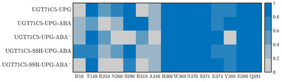 The hydrogen bonding interactions between UPG and UGT71C5. The color indicates the proportion of hydrogen bonds during the simulation. The description of the systems is consistent with Figure 2.
