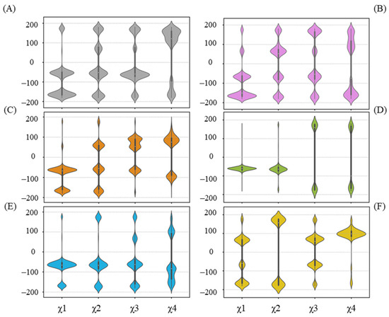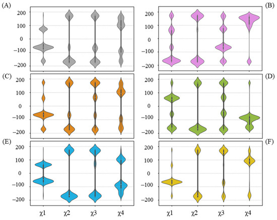 Distribution of side-chain chi (χ) angles of R258 in each system. (A) UGT71C5 system; (B) UGT71C5-UPG system; (C) UGT71C5-UPG-ABA system; (D) UGT71C5-UPG-ABA− system; (E) UGT71C5-SSH-UPG-ABA system; (F) UGT71C5-SSH-UPG-ABA− system. The description of the systems is consistent with Figure 2.