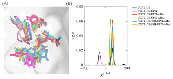 (A) The conformations of the U-shaped loops in representative structures selected based on clustering analysis. Salmon, warm pink, and firebrick correspond to UGT71C5 system; magenta and hot pink correspond to UGT71C5-UPG system; orange and yellow-orange correspond to UGT71C5-UPG-ABA system; lime green corresponds to UGT71C5-UPG-ABA− system; marine and sky blue represent the UGT71C5-SSH-UPG-ABA system; sand and deep olive correspond to UGT71C5-SSH-UPG-ABA− system. UPG and Y388 are shown as colored sticks, with their colors matching those of the corresponding U-shaped loops. (B) The probability distribution function (PDF) of the χ1 angle of Y388. The description of the systems is consistent with Figure 2.