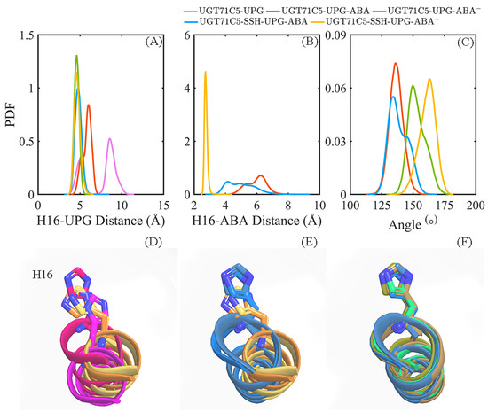Information related to ABA glucosylation. The probability distribution function (PDF) of the distances between the Nε2 atom of H16 and anomeric C1’ atom of UPG (A), and the O atom on the hydroxyl group of ABA (B). (C) The PDF of the OABA-C1UPG-O1UPG angle. (D–F) Alignments of the α-helix structure containing H16, based on representative structures. (D) Alignment of UGT71C5-UPG structures in magenta and hot pink, and UGT71C5-UPG-ABA structures in orange and yellow-orange. (E) Alignment of UGT71C5-UPG-ABA structures in orange and yellow-orange, and the UGT71C5-SSH-UPG-ABA structures in marine and sky blue. (F) Alignment of UGT71C5-UPG-ABA− structure in lime green, UGT71C5-SSH-UPG-ABA structures in marine and sky blue, and UGT71C5-SSH-UPG-ABA− structures in sand and deep olive.