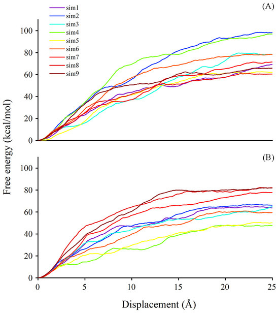 SMD simulation [64,65,66] is a technique to manipulate the system from an initial configuration to a target configuration by applying an external force. In the present work, SMD simulations were performed to pull deprotonated ABA out of the sugar–acceptor binding site of UGT71C5 and persulfidated UGT71C5. The three equilibrated structures obtained from CMD simulations for each of the two UGT71C5 complexes served as the initial coordinates for the SMD simulations. And, three independent 2 ns simulations were performed for each equilibrated structure, resulting in a total of nine simulations for each complex. During the SMD simulation stage, a pulling force with a spring constant of 10 kcal mol−1 Å2 was applied to pull the product out of the active site, where the force along the line connecting the center of mass (COM) of the ABA and residues within 5 Å2 of deprotonated ABA.