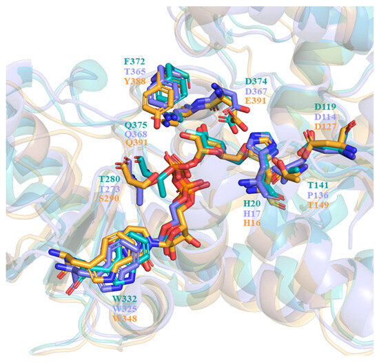 In describing the substrate recognition of UGT71C5, the structure of donor and acceptor binding sites should be noted. The structure of the UPG-binding site in UGT71C5 is compared to that of other enzymes with similar enzymatic functions, like the flavonoid UGT VvGT1 from V. vinifera (PDB ID: 2c1z [28]) and anthocyanidin UGT78K6 from Clitoria ternatea (PDB ID: 4whm [30]). The comparison of the donor binding schemes is shown in Figure 12. It was found that two residues interacting with glycosyl moieties were invariant between VvGT1 and UGT78K6, that is, D374 and Q375 in VvGT1 were conserved as D367 and Q368 in UGT78K6. In the case of UGT71C5, Q391 is equivalent to its counterparts, but E390 instead of D374 in VvGT1 and D367 in UGT78K6 participates in the recognition of the glycosyl moiety. Additionally, another residue, T141, in VvGT1 that interacts with the glycosyl moiety is replaced by P137 in UGT78K6, whereas it is retained as T149 in UGT71C5. Therefore, as it were, the position of the glycosyl moiety would be basically same in the functionally similar UGTs.