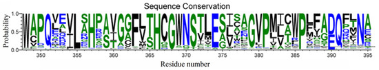 A consensus signature motif known as PSPG in most plant glucosyltransferases. Residues are numbered by the reference to UGT71C5. The sequence alignment obtained from webserver (https://gremlin.bakerlab.org/ (accessed on 5 January 2024)) and the generated figure using webserver (https://weblogo.threeplusone.com/ (accessed on 5 January 2024)).