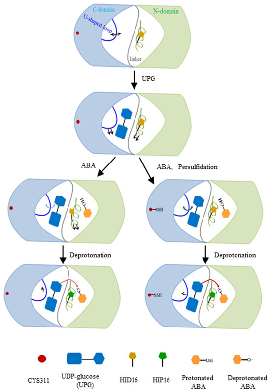 Comparative and quantitative proteomic analyses, used to detect persulfidated proteins in Arabidopsis leaves treated with exogenous ABA, revealed that UGT71C5 exhibited a significant reduction in persulfidation levels. Specifically, UGT71C5 showed a 4.31-fold decrease after 3 h of ABA treatment, which decreased to 2.20-fold after 6 h compared to the control condition [41]. These findings suggest that the persulfidation of UGT71C5 varies dynamically with the duration of ABA treatment, potentially implicating it in ABA signaling transduction pathways. This variability implies that UGT71C5’s persulfidation status may regulate its enzymatic activity, and thus influence the level of free ABA in plants. We thereby modeled two ternary complexes in which UGT71C5 was in a persulfidated state (persulfidated UGT71C5 complexed with UPG, and protonated ABA together with deprotonated ABA). The deprotonation of ABA by catalytic histidine is important for glycosylation. As our results show, in the case of protonated ABA binding to UGT71C5, persulfidation positions catalytic histidine (H16) optimally, which facilitates the deprotonation of ABA. Combining the data of RMSD calculations for the glycosyl moiety (Figure S5A) and hydrogen bonding interaction maps between UPG and UGT71C5 (Figure 6), we obtained information explaining the mentioned effect exerted by persulfidation. The RMSDs show that the positional fluctuation in the glycosyl moiety is larger in persulfidated systems relative to their non-persulfidated counterparts. This is probably because the movement of UPG establishes a hydrogen bond connection with H16, supporting H16 in the appropriate position, which prepares for deprotonation. After the deprotonation of ABA by H16, ABA is stable at the acceptor binding site, and the connection between UPG and H16 is also considerably weakened. Then, in the case of deprotonated ABA binding to UGT71C5, persulfidation assists in the reorientation of UPG and ABA closer to the ‘Michaelis’ configuration (Figure 10C), facilitating the transfer of the glycosyl moiety. Thus, persulfidation plays a part in the deprotonation of ABA and the transfer of the glycosyl moiety, and the model representation of the regulatory role played by persulfidation in UGT71C5 is shown in Figure 14 with a detailed explanation.