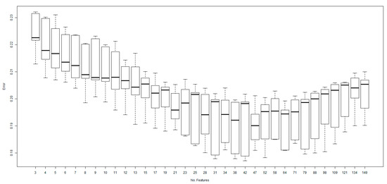 The performance of the model in terms of prediction error as a function of the number of features included in the model is shown in Figure 1. Removing features increased model performance up to a point (e.g., 47 features), because removing the less informative features reduced noise and biases. However, as the removal process progressed, elimination of explanatory features led to information loss and poorer predictive model performance.