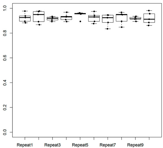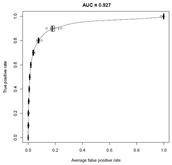 The performance of the final model, as assessed by the area under curve for the receiver operator curve was 0.927, reflecting a good accuracy for the model, with good ability to recover a large portion of what is already known (Figure 2). The variation of model performance was ~90% when assessed in the cross-validation process over ten repeats of the outer loop (Figure 3).