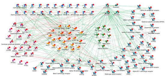 Using information curated in MetaBaseTM, the existence of direct connections between the highest ranked 250 targets was assessed. Utilizing the information from literature-derived protein–protein interaction targets seemed to closely interact, representing a densely interconnected system involved in neurotransmission and related functions of the central nervous system (Figure 4).