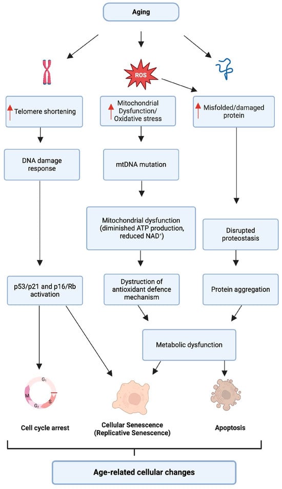 Mitochondria serve as the primary source of cellular energy through oxidative phosphorylation and are involved in apoptosis and signal transduction [55]. A byproduct of mitochondrial oxidative respiration is the generation of reactive oxygen species (ROS), which can damage cellular macromolecules [56], including the mitochondrial genome (mtDNA). This can disrupt respiratory complex efficiency and enhance further ROS production in a vicious cycle.