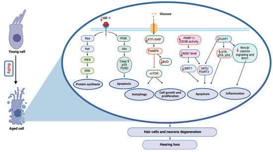 Overview of the molecular pathways involved in aging and hearing loss. IGF-1 and glucose metabolism pathways intersect with cellular processes. Aging is associated with reduced IGF-1 signaling, affecting the Ras/Raf/MEK/ERK cascade critical for protein synthesis and cell survival. Decreased glucose availability alters the ATP/AMP ratio, leading to increased AMPK activity and subsequent effects on the mTOR pathway, which is essential for cell growth and proliferation. Moreover, age-related decline in NAD+ level impacts SIRT1 activity, a key regulator of apoptosis and inflammation, through its action on the Nrf2/SIRT3 pathway. These pathways and alterations in Bcl2, Caspase 3/9, FOXO, and cell cycle regulators such as p16, p19, and p53 lead to increased cellular apoptosis and autophagy. Concurrently, dysregulation of the Wnt/β-catenin signaling and inflammation through BubR1 and Bmi1 contribute to this process. The culmination of these molecular events results in the degeneration of hair cells and neurons in the auditory system, leading to hearing loss.