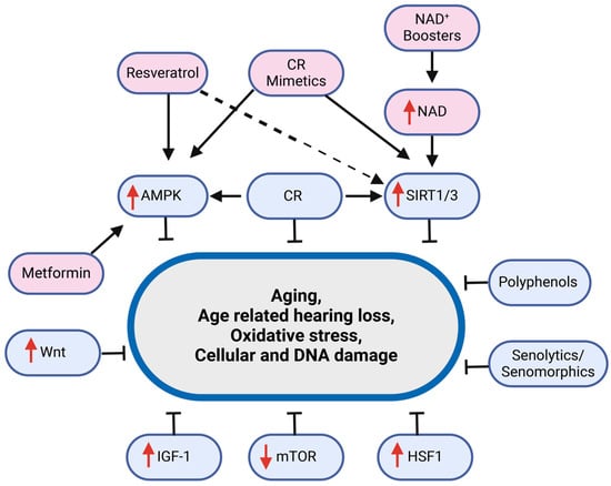 As life expectancy has increased over the last century, the aging of the baby boomer generation, and the onset of their age-related diseases and conditions represent a significant financial burden for developed and developing countries. ARHL, as a prevalent condition affecting quality of life and cognitive function, is a particularly important target for intervention. The development of anti-aging interventions gives hope to postpone and protect against various chronic diseases, including ARHL, and improve the healthspan by establishing protective and rejuvenating responses through targeting age-related pathways, as illustrated in Figure 3 [182].