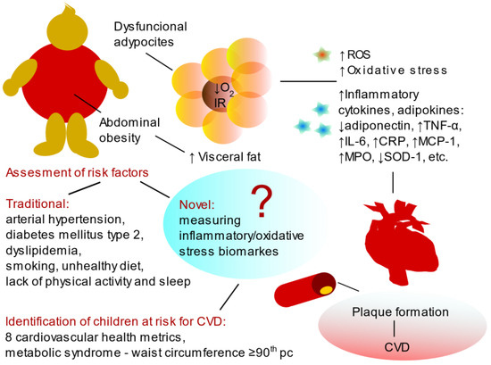 To conclude, obesity and its related conditions contribute to the progression of atherosclerosis, affecting not only adults but also children [13]. It is clear that systemic inflammation and oxidative stress impact the cardiovascular health of children and young adults from an early age [114], emphasizing the need for further detailed research in this area (Figure 1).