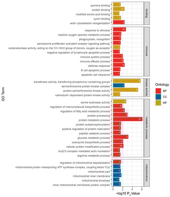 Histogram for GO enrichment and classification of differential proteins for the LPS group and the PQQ + LPS group. The ordinate represents the GO term, and the horizontal axis represents −log10P value. The number at the top of the column denotes differences in protein numbers in the GO term. Metabolic process: GO terms related to differential enrichment are associated with metabolism. Mitochondrion: GO terms related to differential enrichment are associated with mitochondria. Immune: GO terms related to differential enrichment are associated with immune functions. Binding: GO terms related to differential enrichment are associated with various molecular binding activities. Kinase activity: GO terms related to differential enrichment are associated with various kinase activities. BP, biological process. CC, cellular component. MF, molecular function, n = 3.