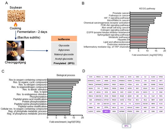 Figure 1. Identification, functional evaluation, and network pharmacology analysis of 8PG. (A) Methodology for preparing cheonggukjang (CGJ). (B,C) Enriched KEGG pathways and biological process of the overlapped targets of 8PG based on a ShinyGO (ver0.77) web server. (D) Target networks in 8PG. 8PG, 8-prenylgenistein; KEGG, Kyoto encyclopedia of genes and genomes; SIRT1, sirtuin 1.