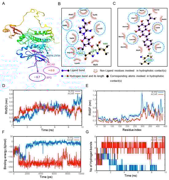 Figure 2. Molecular docking analysis of 8PG and AICAR with AMPK using AutoDock 4.2.6. (A) Binding interactions of the control, AICAR (pink), and 8PG (purple) with the AMPK protein. (B) Two-dimensional pharmacophore analysis between AMPK and the control compound, AICAR (pink box). (C) Two-dimensional pharmacophore analysis between AMPK and the active component, 8PG (purple box). The AutoDock 4 result was used for visualization and pharmacophore analysis. Commonly shared residues between AICAR and AMPK, and 8PG and AMPK were depicted by the cyan blue dotted circle. (DG) Molecular dynamics simulation of 8PG and AMPK, and AICAR and AMPK. (D) RMSD plots between 8PG and AMPK, and AICAR and AMPK. (E) RMSF plots between 8PG and AMPK and AICAR and AMPK. (F) Binding interaction plots between 8PG and AMPK and AICAR and AMPK. (G) Number of hydrogen bonds between 8PG and AMPK and AICAR and AMPK at 10 ns. AICAR, 5-aminoimidazole-4-carboxamide ribonucleotide; 2D, two-dimensional; 8PG, 8-prenylgenistein; AMPK, adenosine 5′ monophosphate-activated protein kinase; ns, nanosecond; RMSD, root-mean-square deviation; RMSF, root-mean-square fluctuation.