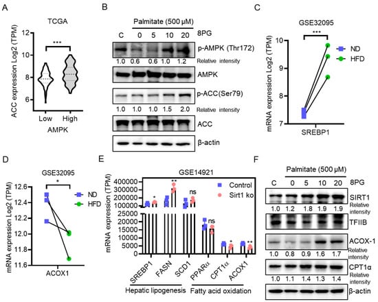 Figure 5. Effect of 8PG on AMPK activation and SIRT1-mediated lipogenesis and fatty acid oxidation in palmitate-treated HepG2 cells. (A) Samples with the highest AMPK expression and samples with the lowest AMPK expression were evaluated to determine the ACC levels in the liver tissue of healthy participants (n = 215) using (GENT2) (http://gent2.appex.kr/gent2/, accessed on 18 January 2024) databases. The data are expressed as mean ± standard deviation (SD), and asterisks (*) indicate significant differences between groups (*** p < 0.001). (B) Protein expression levels of phosphorylated AMPK, and ACC, in palmitate (500 µM)-treated HepG2 cells were analyzed using Western blotting. (C,D) mRNA expression of SREBP-1 and ACOX1 in the liver tissue of ND- and HFD-fed mice were obtained from the GSE32095 dataset (ND, n = 3; HFD, n = 3). Asterisks (*) indicate significant differences (*** p < 0.001) compared with the normal diet group. (E) mRNA expression of SIRT1-linked hepatic lipogenesis and fatty acid oxidation genes in the liver of control and SIRT1 knockout mice were obtained from the GSE14921 dataset (Control, n = 3; SIRT1 ko, n = 3). Asterisks (*) indicate significant differences (* p < 0.05 and ** p < 0.01) compared with the control group. (F) Protein expression levels of, ACOX1, CPT1α, and nuclear expression levels of SIRT1 in palmitate (500 µM)-treated HepG2 cells were analyzed using Western blotting. TFIIB was used as a loading control for the nuclear lysates. 8PG, 8-prenylgenistein; ACC, acetyl-CoA carboxylase; ACOX1, acyl-CoA oxidase-1; AMPK, adenosine 5′ monophosphate-activated protein kinase; CPT1α, carnitine palmitoyltransferase I alpha; FAS, fatty Acid Synthase; HFD, high-fat diet, ND, normal diet, SD, standard deviation; SIRT1, sirtuin 1; SREBP-1, sterol regulatory element-binding protein 1, TCGA, The Cancer Genome Atlas Program, TFIIB, transcription factor II b.