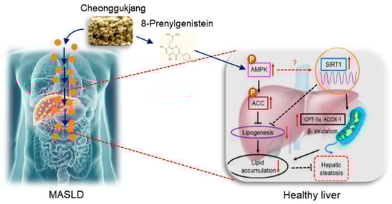 Arulkumar, R., Jung, H. J., Noh, S. G., Kim, H. W., & Chung, H. Y. (2024). 8-Prenylgenistein Isoflavone in Cheonggukjang Acts as a Novel AMPK Activator Attenuating Hepatic Steatosis by Enhancing the SIRT1-Mediated Pathway. International Journal of Molecular Sciences, 25(17), 9730. https://doi.org/10.3390/ijms25179730