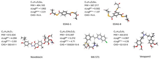 In the first stage of in silico research, optimization of the compounds EDAG-1, EDAG-8, and reference ligands (novobiocin, verapamil, and MK-571) was carried out using the Gaussian program. Additionally, the molecular weight of the tested compounds and their cLogP were calculated using the Reaxys chemistry database and the Molinspiration software (version 2024). Optimized structures of five ligands and their chemical formula, molecular weight, cLogP, and CAS number are shown in Figure 1.