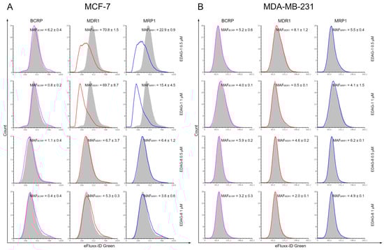 Cytometric analysis of the BCRP, MDR1, and MRP1 resistance protein activities in MCF-7 (A) and MDA-MB-231 (B) breast cancer cells exposed for 24 h to the selenoesters EDAG-1 and EDAG-8. The tested breast cancer cells were incubated with Efflux Green Detection Reagent and the appropriate inhibitors (novobiocin, verapamil, and MK-571). The gray-filled histogram presents the fluorescence of cells not exposed to the inhibitor, while the pink, red, and blue histograms represent cells treated with the BCRP, MDR1, and MRP1 inhibitors, respectively. The difference in mean fluorescence intensity (MFI) indicates the corresponding ABC transporter activity. The MDR activity factors (MAF) with SD (standard deviation) in the upper-right corner quantify characteristics related to multidrug resistance.