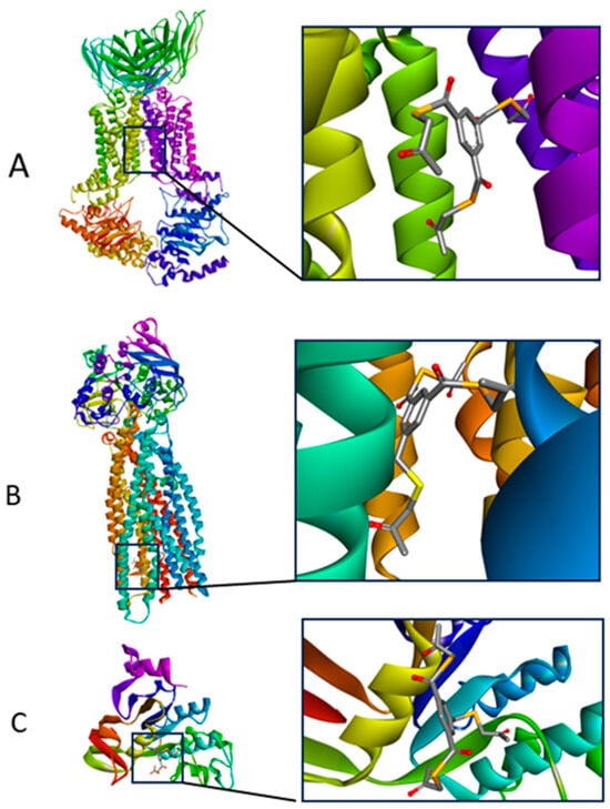 The lowest-energy docking poses of compound EDAG-8 with BCRP (A), MDR1 (B), and MRP1 (C) proteins.