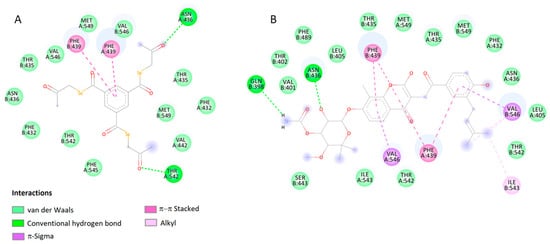 Analyzing the interactions of the compound EDAG-8 with the BCRP protein (Figure 4A, Table 2), two strong hydrogen bonds are visible between the ligand ketone groups and ASN436 and THR542 located in the A chain of the protein’s binding site. Furthermore, the benzene ring of the ligand generates π–π staking interactions with the benzene ring of PHE439 located in the A and B chains of the protein. The arrangement of the compound EDAG-8 in the binding pocket of the BCRP protein is similar to the spatial arrangement of the reference novobiocin (Figure 4B). In this complex, a hydrogen bond is visible between the ligand and ASN436. PHE439 located in the A and B chains of the BCRP protein is also involved in the stabilization of the complex.