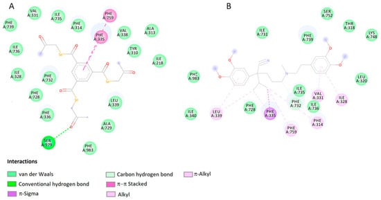 A similar pattern of interaction is visible in the complex of EDAG-8 and the MDR1 protein (Figure 5A). One of the ketone groups of the ligand forms a hydrogen bond with the protein binding site SER979, and the benzene ring interacts through π–π stacking interactions with the benzene rings of two phenylalanine residues (PHE335 and PHE759). When comparing the verapamil nature of the interactions at the target protein (Figure 5B), it should be emphasized that they are only hydrophobic. There are no stronger hydrogen bond interactions in the obtained complex.