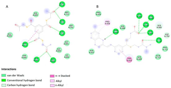 In particular, numerous interactions are visible between the ligand and the MRP1 protein (Figure 6A). The complex shows six hydrogen bonds generated by the carbonyl oxygen atoms of the ligand and the amino acids of the protein binding site (TRP653, SER685, SER686, TYR710, GLN713, and GLN714). Additionally, π–π stacking interactions are visible between the aromatic rings of the ligand and TRP653. A similar pattern of interactions is observed between the target protein and the reference compound MK571 (Figure 6B). The MK571 and MRP1 protein is also stabilized by six hydrogen bonds and is additionally stabilized by π–π stacking interactions. This nature of the interactions, similar to the interactions in the EDAG-8 selenoester, shows the high modulatory potential of the EDAG-8 derivative.