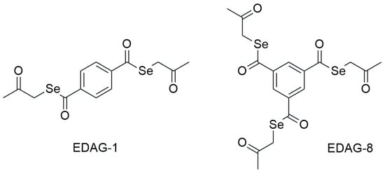 Two Se-compounds were investigated—EDAG-1 [Se,Se-bis(2-oxopropyl) benzene-1,4-bis(carboselenoate)] and EDAG-8 [Se,Se,Se-tris-(2-oxopropyl) benzene-1,3,5-tris-(carboxyselenoate)] (Figure 7). These compounds have a ketone end fragment and two or three selenoester moieties in their molecule. Their detailed synthesis and chemical characterization have been described in a patent application [].