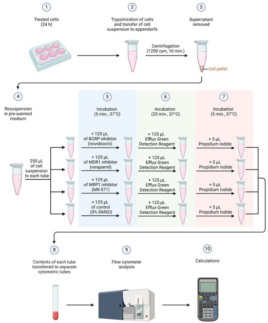The effect of the tested compounds on the activity of MDR transporters in MCF-7 and MDA-MB-231 breast cancer cells (baseline seeding density: 5 × 105 cells/well—manufacturer recommendation) was evaluated after 24 h of incubation with them at concentrations of 0.5 and 1 µM (rounded mean IC50 and 2 x IC50 values obtained in the MTT assay from our recent study []). The MDR Assay kit (Abcam, Cambridge, UK) was used for this purpose. The most significant component included in this kit is Efflux Green Detection Reagent—a substrate for the tested ABC transporters (BCRP, MDR1, MRP1). When resistance proteins are not actively pumping out this reagent, it is degraded by intracellular esterases, causing the dye to be retained inside the cell. Therefore, the mean fluorescence intensity (MFI) depends on the activity of the transporter proteins present in the cell membrane and is inversely proportional to their activity. The lower the activity of the resistance proteins, the more dye is retained in the cell, and the MFI is higher. The entire assay was conducted following the manufacturer’s instructions available on their website. After 24h, the cells were collected and washed twice with PBS (2 × 5 mL) by centrifugation (1200 rpm, 10 min). Further, the supernatant was removed, and the cells were counted utilizing a Scepter 3.0 handheld automatic cell counter (Millipore, Burlington, MA, USA). Then, the cells were resuspended (density 2 × 106 cells/mL) in a pre-warmed culture medium (Dulbecco’s Modified Eagle Medium, Gibco, San Diego, CA, USA), and each sample was divided into four parts (250 µL each). Diluted inhibitor or medium containing 5% DMSO was added to each tube according to the scheme: 1A—125 µL MDR1 inhibitor (verapamil), 1B—125 µL MRP1 inhibitor (MK-571), 1C—125 µL BCRP inhibitor (novobiocin), 1D—125 µL medium/5% DMSO (sample without inhibitor), 2A—125 µL MDR1 inhibitor (verapamil), 2B—125 µL MRP1 inhibitor (MK-571), etc. Baseline concentrations of each used inhibitor were 80 µM, 200 µM, and 400 µM (concentrations imposed by the kit manufacturer) for verapamil, MK-571, and novobiocin, respectively. Such prepared samples were incubated for 5 min in an incubator providing optimal growth conditions for cell culture (5% CO2, 37 °C, and 90–95% humidity). After the required incubation time, 125 µL of Efflux Green Detection Reagent (previously diluted in the medium at the 1:50 ratio) was added to each sample, pipetted (avoiding the introduction of bubbles), and incubated again for 30 min under the same conditions as before. After 25 min of incubation, 5 µL of propidium iodide (250 µg/mL) was added to each tube and incubated for the remaining 5 min. Following this time, thus prepared samples were transferred to cytometric tubes and immediately analyzed using a flow cytometer (BD FACSCanto II; 10,000 events measured; flow rate 100–300 events/sec) with FACSDiva 6.0 software (both from BD Biosciences Systems, San Jose, CA, USA), and then with FCS Express 7 software (De Novo Software, Pasadena, CA, USA). Additionally, the autofluorescence levels of the culture medium alone (without cells; DMEM) and of MCF-7 and MDA-MB-231 breast cancer cells were also measured (the original autofluorescence histograms of culture medium and breast cancer cells from flow cytometry analysis, see Supplementary Materials). The equipment was calibrated with BD Cytometer Setup and Tracking Beads (BD Biosciences, San Diego, CA, USA).