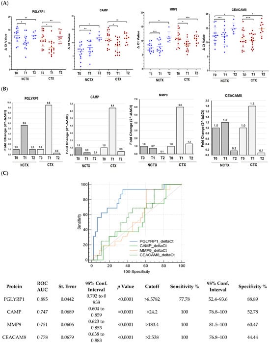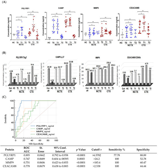 Paired-wise analyses were conducted to determine the changes in the protein markers after the first cycle of chemotherapy (T1) and at >2 years after treatment (T2) in comparison with the baseline (T0) in the two examined groups of patients. In both groups (CTX and NCTX), the plasma levels of PGLYRP1, CAMP, MMP9, and CEACAM8 increased significantly (p < 0.05) after the first chemotherapy cycle in comparison with the baseline (T1-T0) (Table 3) and the cutoff value (Figure 2B). At >2 years post chemotherapy (T2), the protein levels of PGLYRP1 and CAMP dropped below T0 (Table 3) and the cutoff value (Figure 2B) in the CTX group, but they were still higher than the levels of the healthy controls (HCs) (Table 2) and the levels in the NCTX group (Figure 2B, Table 3). At this time point (T2), MMP9 also decreased in comparison with T1; it was higher than the baseline (T2-T0), but not significantly (Table 3, Figure 2B).
