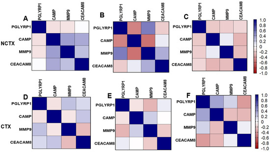 Pairwise Pearson correlations between plasma markers among the study samples by cardiotoxicity and by time points. CTX, cardiotoxicity; NCTX, non-cardiotoxicity. (A) NCTX at T0; (B) NCTX at T1; (C) NCTX at T2; (D) CTX at T0; (E) CTX at T1; (F) CTX at T2.