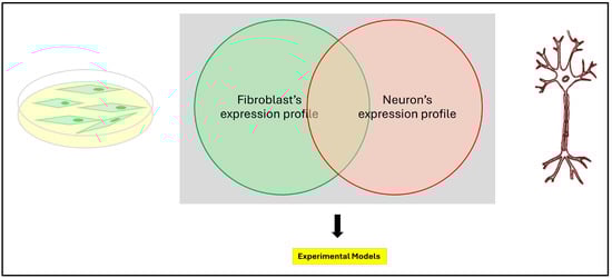 Fibroblasts derived from PD patients with mutations in genes, such as PINK1, Parkin, and DJ-1, have been employed to investigate mitochondrial dysfunction, a key pathological feature of PD. These studies have revealed abnormalities in mitochondrial morphology, function, and dynamics, providing insights into disease mechanisms and potential therapeutic targets [24]. Similarly, fibroblasts from patients with familial AD forms carrying mutations in the amyloid precursor protein (APP) showed significantly higher levels of heat-shock proteins, HSP90 and HSP70, as confirmed by Western blot analysis [25]. In the same study, it was shown that fibroblasts from patients with familial AD forms, with mutations in the Presenilin 1 gene, exhibited changes in signaling pathways associated with cellular stress, autophagy, lysosomes impairment, and tau phosphorylation. Therefore, these observations indicate that fibroblasts could be a valuable tool in modeling neurodegeneration-related pathways and identifying early biomarkers for Alzheimer’s disease [25]. As an example, fibroblasts from patients with tauopathies, such as frontotemporal dementia (FTD) and progressive supranuclear palsy (PSP), have been employed to study tau protein aggregation and toxicity. For instance, the findings of a study by Ibanez-Salazar and colleagues [26] suggested that the phosphorylation state and accumulation levels in subcellular compartments of Tau are modified by oxidative stress through mechanisms, which despite not being completely understood, have been observed previously in neuronal models of tauopathies [27].