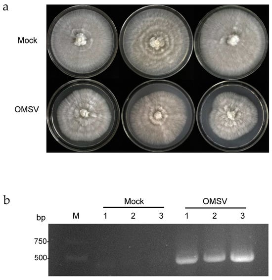 The mycelium growth of OMSV-free (Mock) and OMSV−infected (OMSV) P. ostreatus strains. (a) The mycelium growth on PDA plates after seven days of cultivation. (b) RT-PCR detection of OMSV. Lane M, DNA Marker2000. Numbers 1–3 represent three biological replicates.