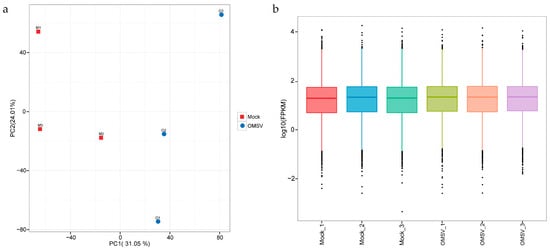 Gene expression analysis of OMSV-free (Mock) and OMSV-infected (OMSV) strains of P. ostreatus. (a) Principal component analysis (PCA) of each sample. The FPKM values of each sample were used to perform PCA. (b) The FPKM box plots of each sample. The horizontal axis represents the sample names, while the vertical axis displays the log10 (FPKM) values. Different colors denote distinct samples.