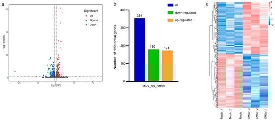 Differentially expressed genes (DEGs) in OMSV infection were identified using a false discovery rate (FDR) corrected p-value ≤ 0.05 and a fold change ≥ 1.5. The sequencing results revealed 354 DEGs on comparing the OMSV−infected strain with the OMSV-free strain (Figure 3a). Among these 354 DEGs, 174 were upregulated and 180 were downregulated (Figure 3b). The heat map of the hierarchical cluster analysis further supported these results, confirming the difference between the two sample groups (Figure 3c).