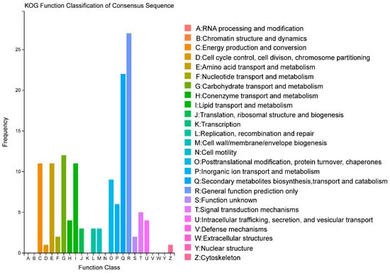 KOG analysis of the DEGs of OMSV-free and OMSV-infected P. ostreatus strains. The vertical axis indicates the number of DEGs within a specific functional cluster, while the horizontal axis represents the functional classes.