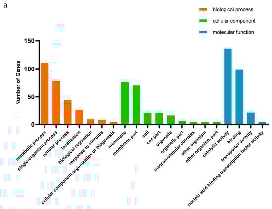 The 230 DEGs annotated in the Gene Ontology (GO) database were dispersed across 30 functional categories, including 12 subclasses in biological process (BP), 11 subclasses in cell component (CC), and 7 subclasses in molecular function (MF). Among these 230 DEGs, 119 were upregulated and 111 were downregulated. In the BP branch, the three subcategories containing the most DEGs were metabolic processes, single-organism processes, and cellular processes with 111, 78, and 44 DEGs, respectively. In the CC branch, the 2 subclasses containing the most DEGs were membrane and membrane part, with 76 and 70 DEGs, respectively. In the MF branch, the 3 subclasses with the most DEGs were catalytic, binding, and transporter activities with 136, 99, and 21 DEGs, respectively (Figure 5a). GO functional enrichment analysis was performed to explore the infection mechanism of OMSV at the molecular level. This analysis was conducted for both upregulated and downregulated DEGs, yielding distinct and significant results. A significant enrichment of upregulated DEGs was noted in primary metabolism, including carbohydrate metabolic processes (GO: 0005975), oxidoreductase activity (GO: 0016491), and hydrolase activity (GO: 0004553), which are crucial for survival during viral infection. Moreover, the downregulated DEGs were mostly enriched in all three branches, including an integral component of the aromatic amino acid family biosynthetic process (GO: 0009073), heme binding (GO: 0020037), iron ion binding (GO: 0005506), monooxygenase activity (GO: 0004497), and membrane (GO: 0016021).