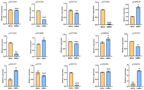 Validation of selected DEGs of OMSV-free (Mock) and OMSV−infected (OMSV) strains of P. ostreatus using qRT-PCR. The statistical analysis included a one-way analysis of variance (ANOVA) and t-tests, * p < 0.05, ** p < 0.01, and *** p < 0.001.