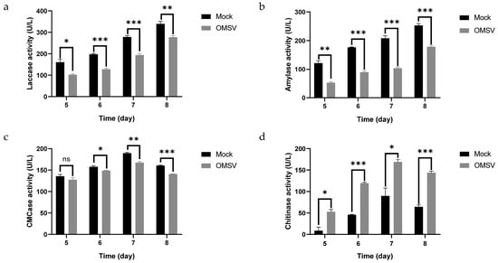 The enzyme activity of OMSV-free (Mock) and OMSV−infected (OMSV) P. ostreatus strains during mycelial growth. (a) Laccase activity; (b) amylase activity; (c) CMCase activity; (d) chitinase activity. Numbers 5–8 denote the days of mycelial growth in liquid medium. The statistical analysis included a one-way analysis of variance (ANOVA) and t-tests, * p < 0.05, ** p < 0.01, and *** p < 0.001.