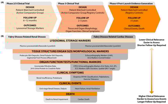 For new therapies, a stepwise approach to assess therapeutic effectiveness can be envisioned, potentially partially in the context of a clinical trial with surrogate endpoints, ideally followed up by the collection of real-world data []. Therapeutic evaluation could start with assessing the effect of reducing glycosphingolipid storage. First, by measuring its effect on plasma lysoGb3 levels as well as assessing storage in tissue biopsies. This takes approximately 6 to 12 months to show significant changes [,,,,]. Next, more organ-specific surrogate markers can be assessed (e.g., electrographic, morphological, or functional cardiac markers), with the greatest challenge being the identification of relevant markers predicting cardiac complications (Figure 1). Once changes in both biomarkers reflecting glycosphingolipid storage and proposed organ-specific surrogate outcomes indicate potential therapeutic effectiveness in a controlled study setting, the subsequent third step involves collecting real-world evidence on the effect of therapy on FD complication rates.